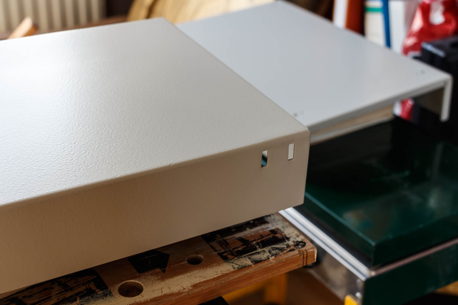 Een spuitbus met RAL7044 was niet te vinden in hun collectie. Mijn ervaring met spuitverf is bovendien niet zo heel goed voor wat betreft de hechting. Zelfs met primer vind ik de toplaag te kwetsbaar en het gladde vind ik bij dit soort apparatuur niet zo mooi.